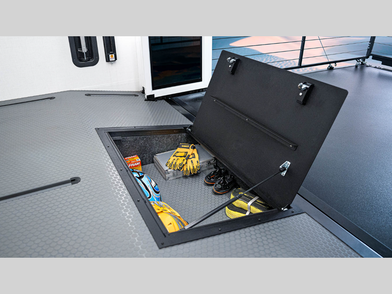 Unmatched luxury, an automotive exterior, tons of storage space, and intelligent features; it has to be a Model G toy hauler fifth wheel by Brinkley!