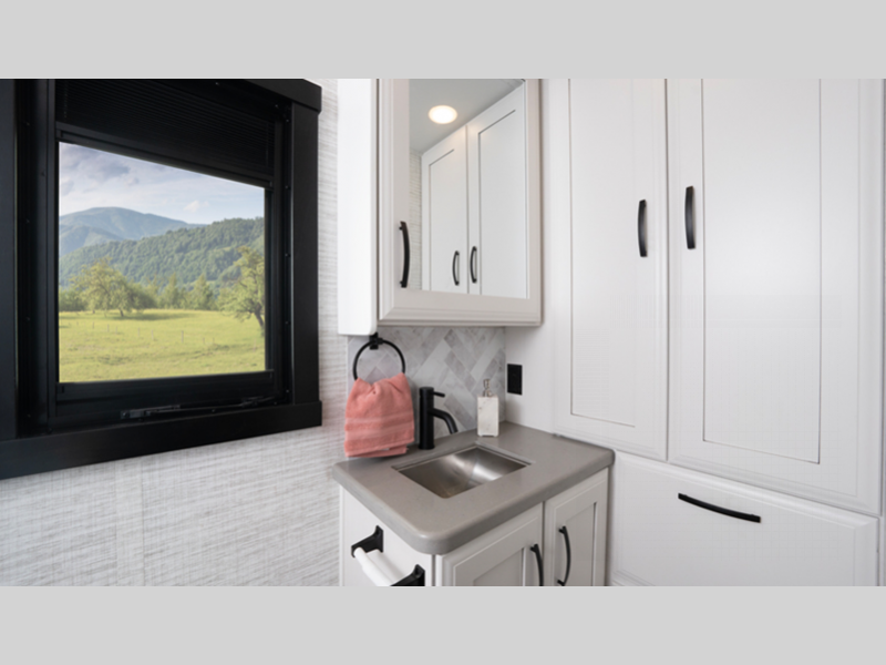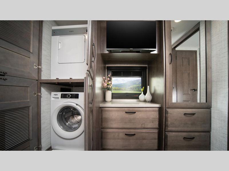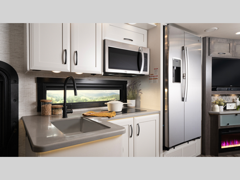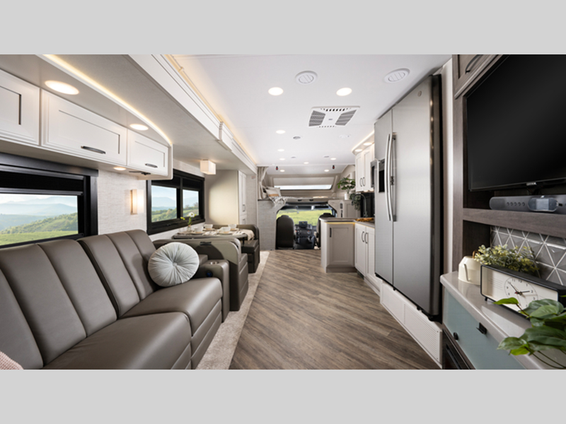 - E-Z Drive™ Premier; Automotive-bonded panoramic window in front cap with power shade; Dual-pane, tinted safety-glass windows; (2) 15,000 BTU A/C units with heat pump on main A/C; Electric patio awning with LED lights; 2,000W pure sine wave inverter; Power cord reel with 50-amp service; Sony® infotainment center with Apple CarPlay® and Android Auto™; Backup and side-view cameras; Residential refrigerator; Residential-size convection microwave