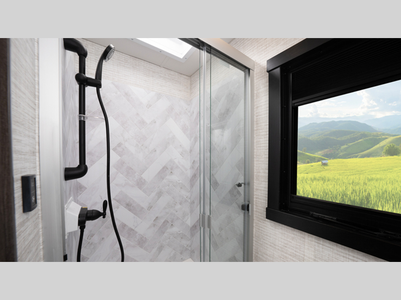 - One-piece, seamless fiberglass front and rear caps; Automotive-bonded panoramic window in front cap with power shade