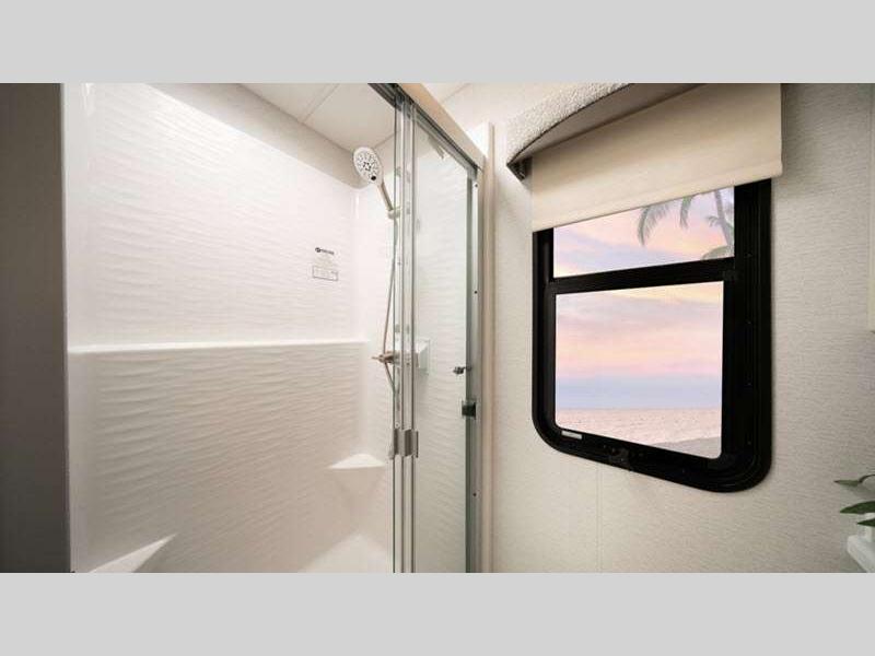 - One-piece, fiberglass shower with glass door, skylight and light