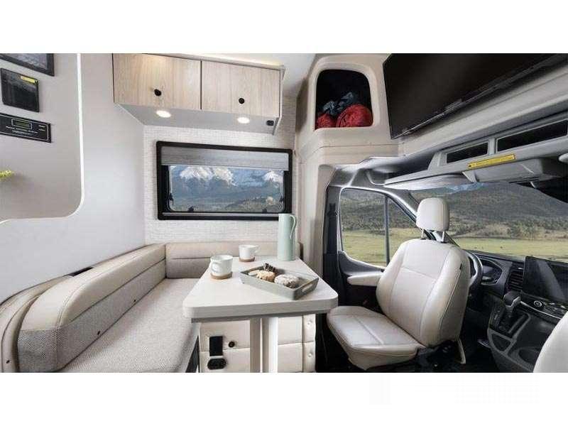 Sleeps 2 Length 23 ft 5 in Ext Width 7 ft 1 in Ext Height 11 ft 1 in Int Height 6 ft 8 in Interior Color Grotto, Oakley Exterior Color Standard Graphics. Graphics Delete Option. Full-Body Paint; Black Hills, Conifer, Magnet, Sandy Oak GVWR 11000 lbs Fresh Water Capacity 53 gals Grey Water Capacity 51 gals Black Water Capacity 4.75 gals Tire Size 205/75R16C Furnace BTU 17000 btu Generator 2,800W Gas Fuel Type Gas Engine 3.5L EcoBoost V6 Chassis Ford Transit 350HD AWD Horsepower 310 hp Fuel Capacity 31 gals Wheelbase 156 in Available Beds Twin Bed with King Conversion Torque 400 ft-lb Refrigerator Type 12V Refrigerator Size 5.3 cu ft Convection Cooking Yes Cooktop Burners 1 Shower Size 30" x 30" Number of Awnings 1 Axle Weight Front 4630 lbs Axle Weight Rear 7275 lbs LP Tank Capacity 6 gal. Water Heater Type Timberline Binar 5D Hydronic AC BTU 13500 btu Awning Info 14' Electric patio awning with auto-retract and LED lights Gross Combined Weight 15000 lbs Shower Type Wet/Bath Shower Electrical Service 30 amp Similar Floorplans