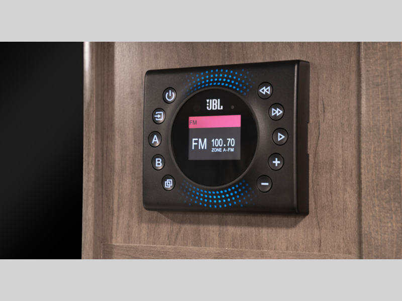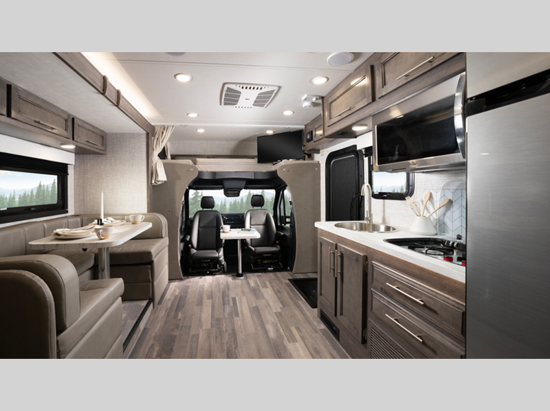 - One-piece seamless fiberglass front cap; Frameless windows; Heated holding tanks; Heated, remote-controlled side-view mirrors; Electric patio awning with LED lights; Backup and side-view cameras; Keyless cab entry; 7 in. integrated MBUX infotainment center; Swivel driver and passenger seats