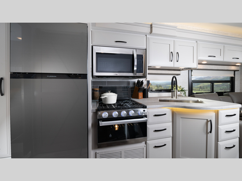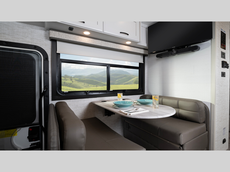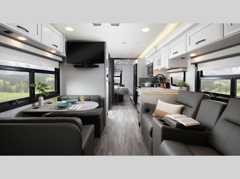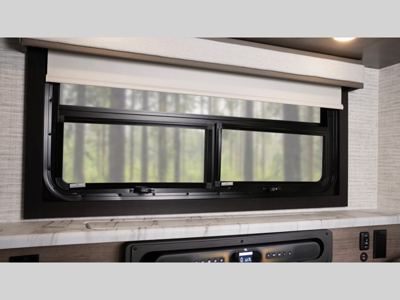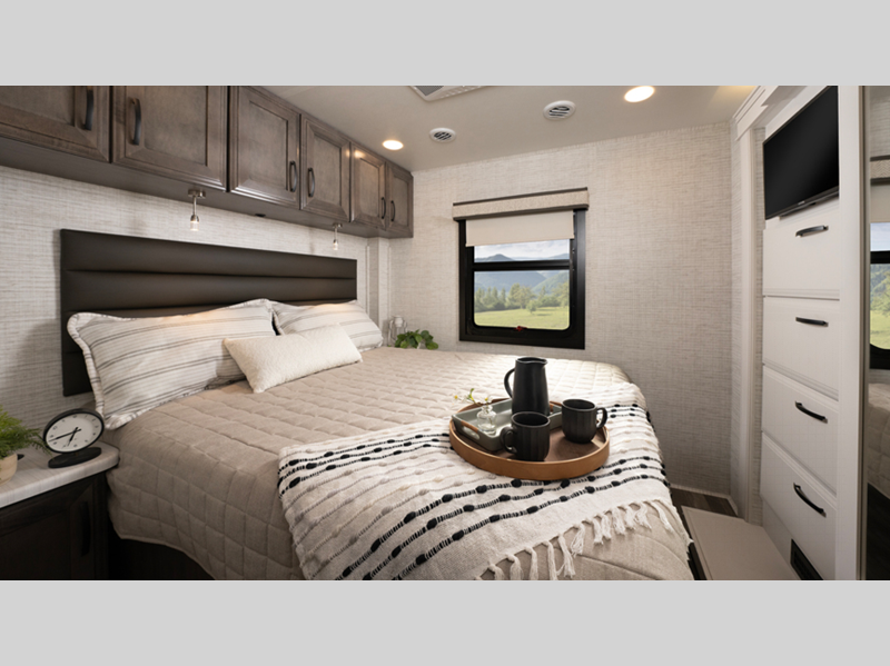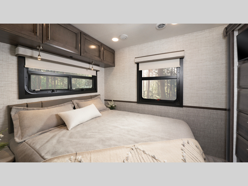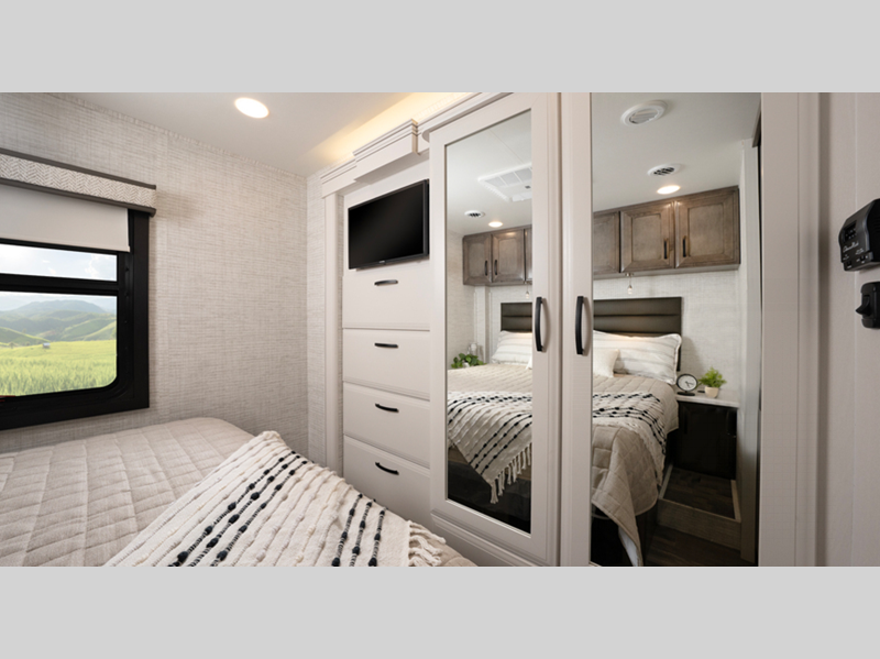 The cockpit offers you a Sony infotainment center with Apple CarPlay and Android Auto, backup and sideview cameras, a 120" panoramic windshield, and a six-way power passenger seat. You will feel right at home with hardwood cabinet doors, drawers and fascia with LED accent lighting, along with blackout roller shades, large wardrobes, and decorative kitchen backsplash!