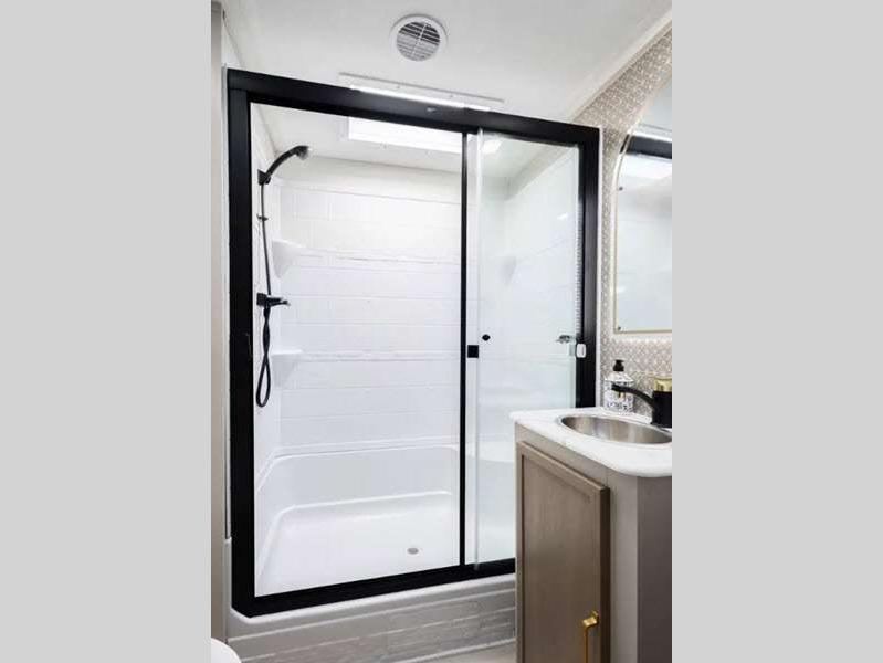 Sleeps 5 Slides 2 Length 34 ft Ext Width 8 ft Ext Height 11 ft 6 in Hitch Weight 1210 lbs Dry Weight 8168 lbs Cargo Capacity 1842 lbs Fresh Water Capacity 45 gals Grey Water Capacity 66 gals Black Water Capacity 30 gals Available Beds Queen with Versa Tilt Refrigerator Type 12V Refrigerator Size 10 cu ft Cooktop Burners 3 Shower Size 30" x 36" Number of Awnings 1 Water Heater Type On Demand Tankless AC BTU 31500 btu TV Info LR 50" LED Smart TV Awning Info 20' with LED Lights Axle Count 2 Washer/Dryer Available Yes Shower Type Walk-In Shower Electrical Service 50 amp Similar Floorplans