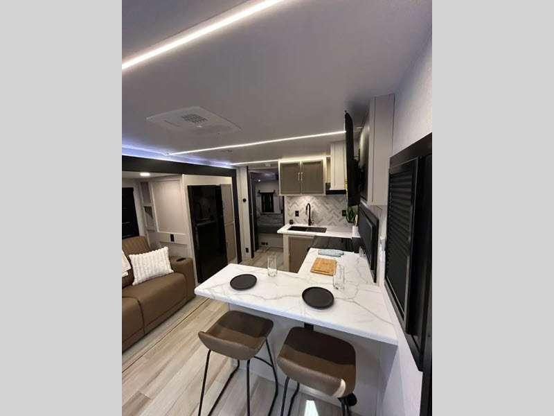 Sleeps 4 Slides 2 Length 35 ft Ext Width 8 ft Ext Height 11 ft 5 in Int Height 0 ft Hitch Weight 915 lbs Dry Weight 8433 lbs Cargo Capacity 1282 lbs Fresh Water Capacity 45 gals Grey Water Capacity 60 gals Black Water Capacity 30 gals Available Beds Queen Refrigerator Type 12V Refrigerator Size 10 cu ft Cooktop Burners 3 Number of Awnings 1 Water Heater Type On Demand Tankless AC BTU 31500 btu Cargo Deck Size 0 ft TV Info 50" LED Smart TV Awning Info With LED Lights Axle Count 2 Shower Type Standard Electrical Service 50 amp Similar Floorplans