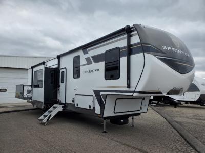 The Sprinter fifth wheels by Keystone feature spacious living areas, plenty of storage, and outstanding towability. Each unit is constructed with 2" thick double welded aluminum frame construction, a fully walkable roof and slide out roof, and dual layer insulation to help extend your camping season. The heated pass-through storage includes lockable slam latch baggage doors so you can easily pack your gear, and the one-touch 4-point leveling system features return hookup memory to have you set up in no-time. Head inside to find DynaSpan Marine Grade floor decking, Thomas Payne luxury collection furniture and residential style seamless marbled countertops to name a few comforts. The Sprinter also includes a Suburban tankless on-demand water heater, black out aluminum wheels, plus a 30k BTU furnace to ensure your comfort!